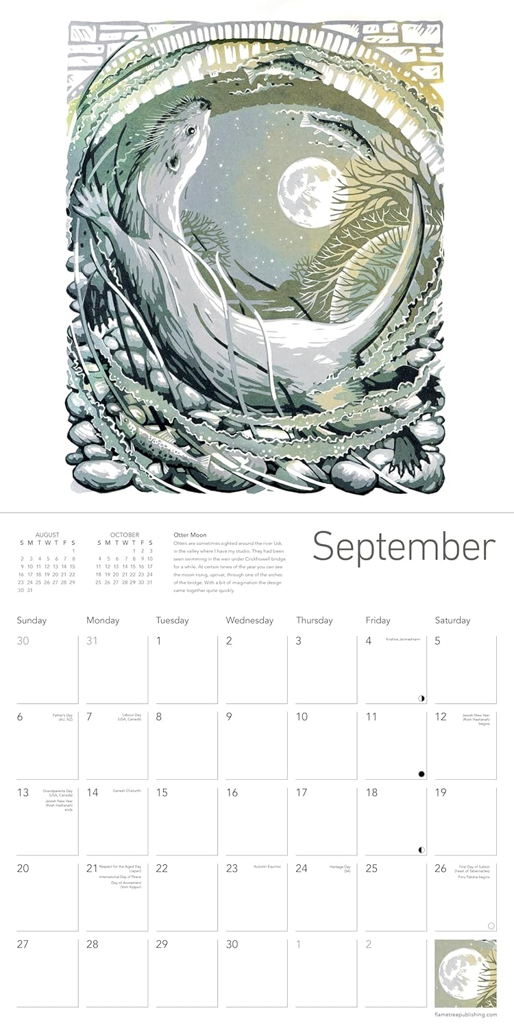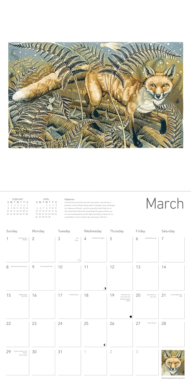 Each month showcases one of his distinctive linocut prints, featuring owls, foxes, badgers, otters, swallows, and more, set against the rich backdrops of the Usk Valley, rugged mountainsides, wildflowers, and twisted trees. Insightful notes from the artist accompany each image, offering a deeper connection to both the artwork and the wildlife it celebrates.