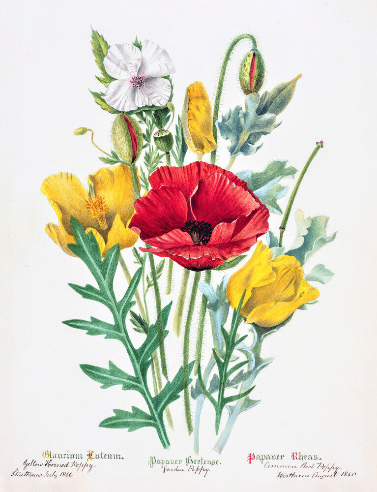 A composition showing Glaucium flavum, Papaever hortense, and Papaver rhoeas painted from plants observed at East Lothian localities between 1860 and 1866.