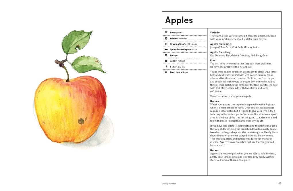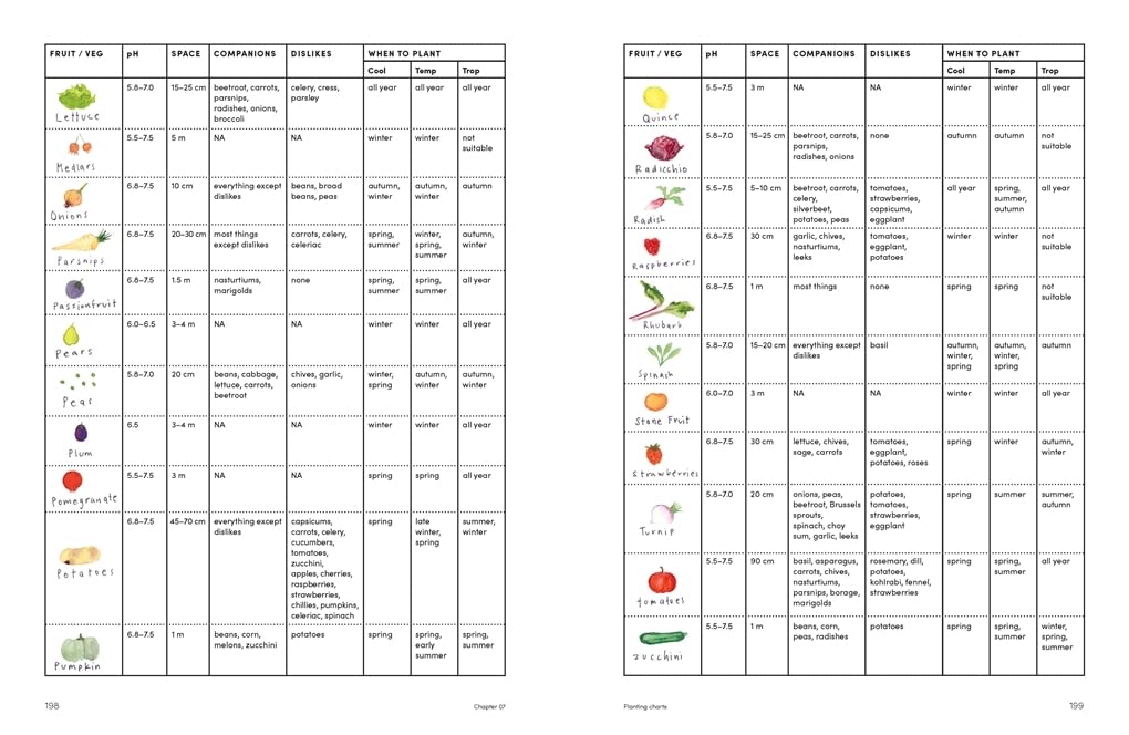 The book features fifty-five plant profiles ranging from the everyday to unique. Each profile is illustrated and has an easy-to-comprehend table detailing the most important information: when to sow and harvest; growing time; space needed between plants; optimal soil pH; whether the plant will tolerate pots and frost; and their companions and dislikes.
