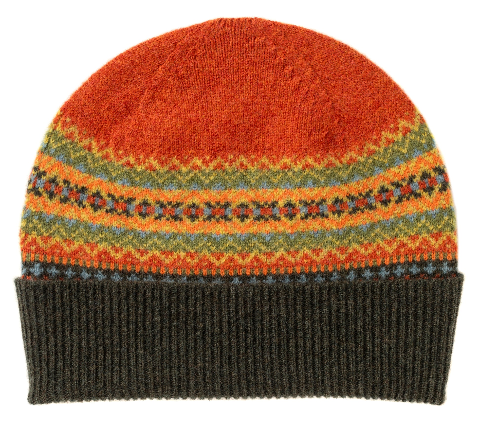 The Eribé Alpine Turnup Hat in Copperland is a modern take on a classic Fair Isle beanie. Knitted in Scotland from 100% Merino lambswool, it features a beautifully detailed Fair Isle pattern and a deep turn-up brim for extra warmth.