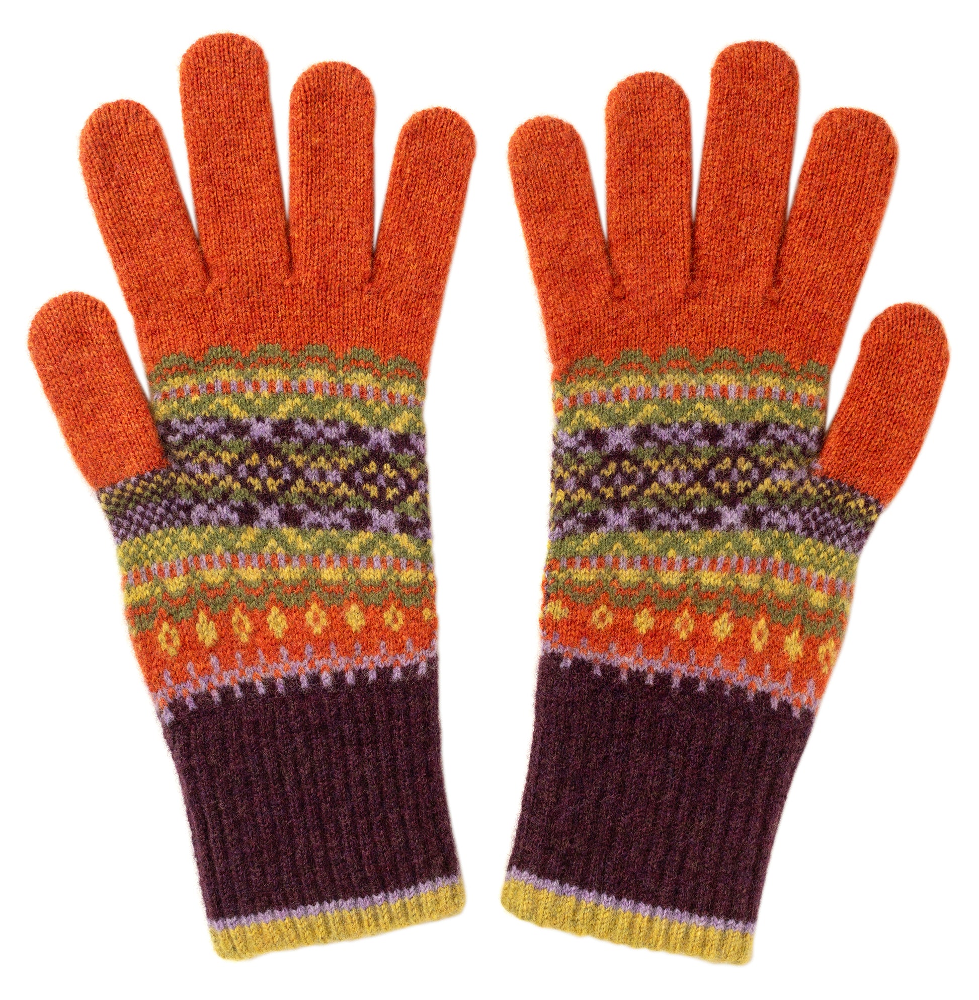 Soft wool gloves by ERIBÉ, featuring a seasonal Fair Isle pattern in warm autumnal shades of orange, dark khaki and yellow with accents of moss green and lilac.