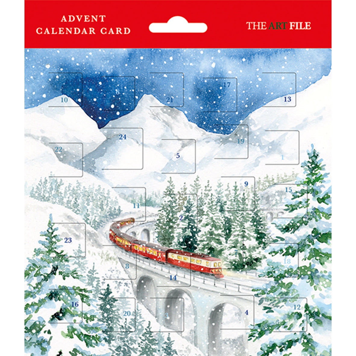 This Alpine Train advent card captures the wonder of a snowy mountain journey at Christmas. Each of the 24 windows opens to reveal a festive illustration, making it a unique way to send Christmas greetings.