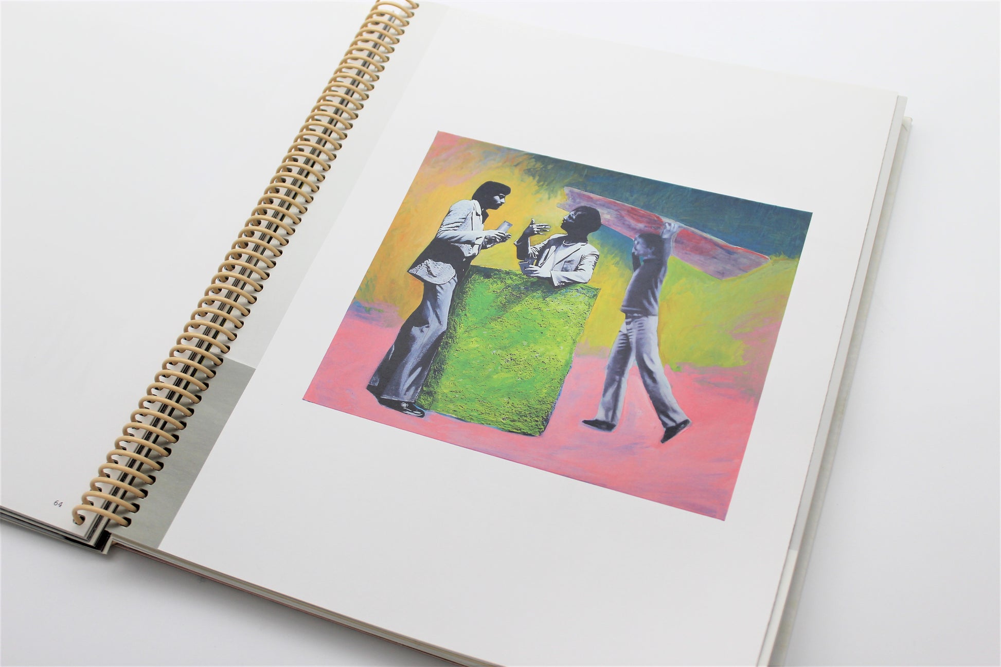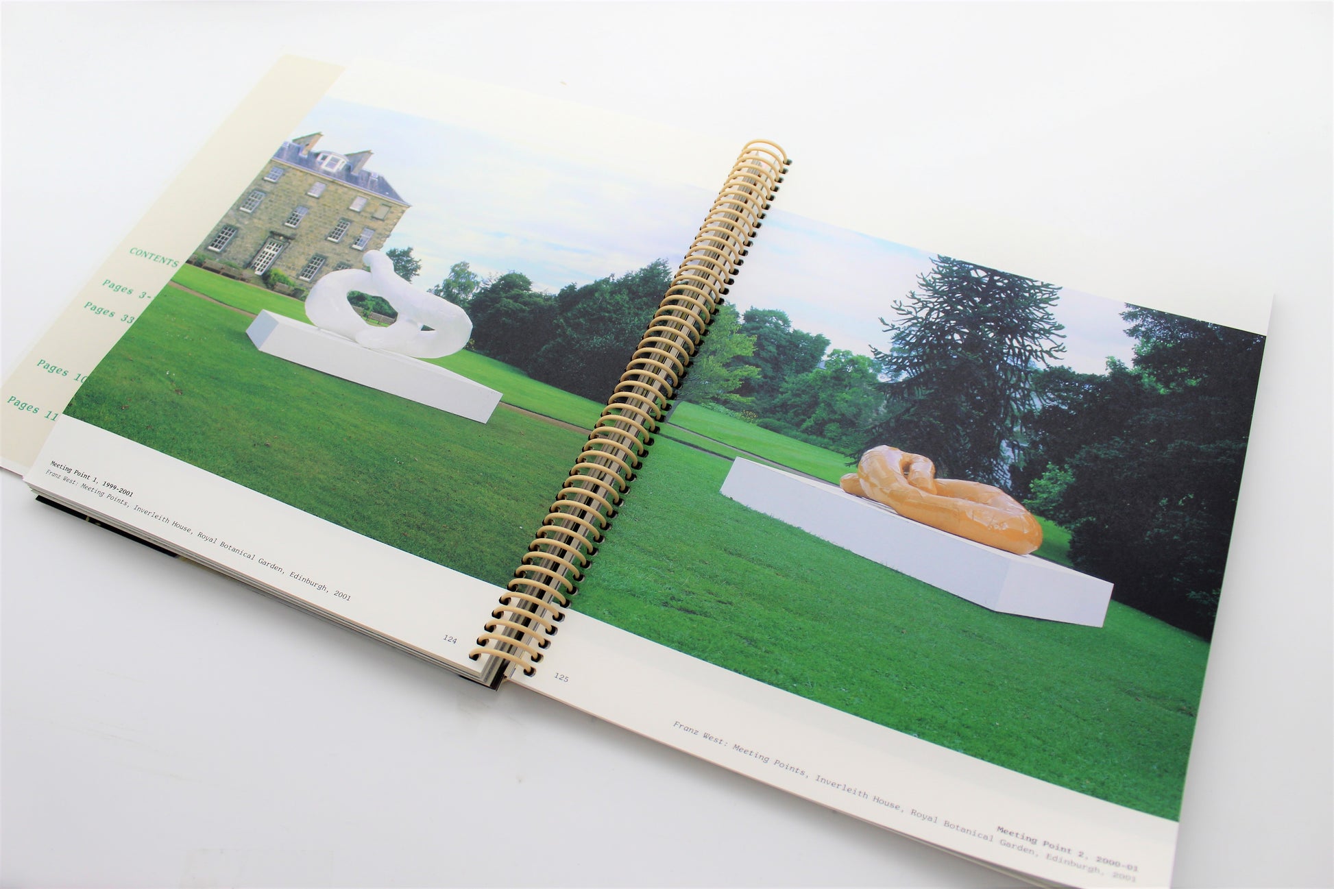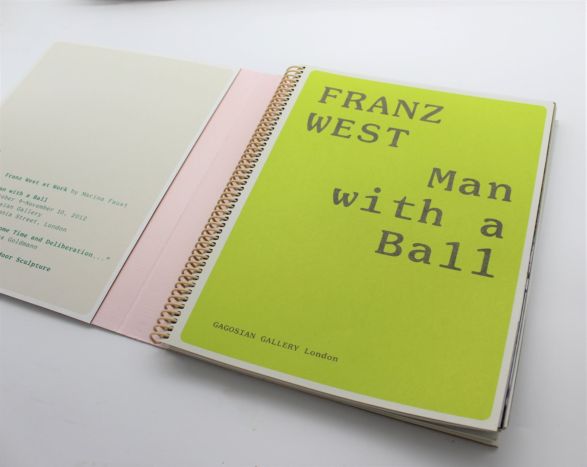 This exhibition catalogue combines Franz West’s final works with a survey of his large outdoor sculpture, bound with chunky plastic coil in a silkscreen and indigo printed fluted-board cover.