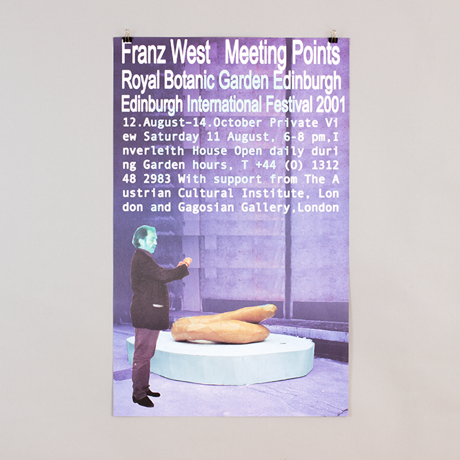 Poster from American artist Franz West's outdoor sculpture exhibition 'Meeting Points' held in Royal Botanic Garden Edinburgh grounds in 2001. The exhibition was on display at the same time with 'The Mountains' by Ed Ruscha.