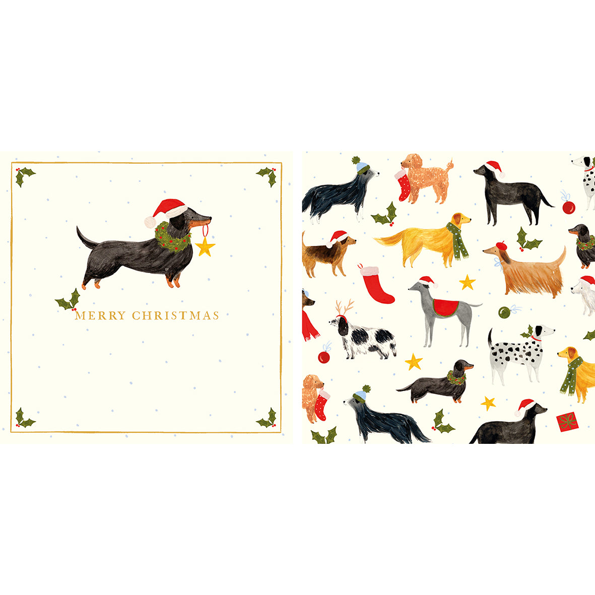 A delightful pack of 10 Christmas cards featuring festive dogs dressed for the season. With five charming designs (two of each), these cards are ideal for sending joyful Christmas wishes.